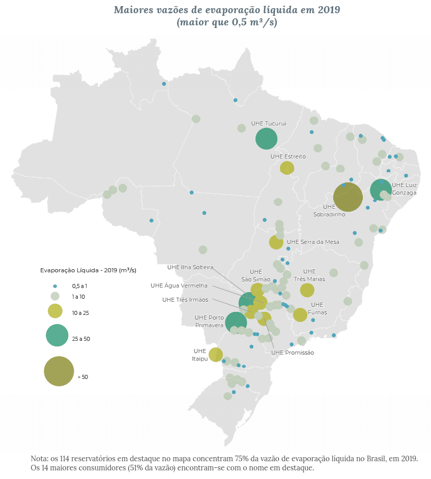 Em 2019, 114 reservatórios apresentaram evaporação líquida superior a 500 litros por segundo e somaram vazão média anual de 666 metros cúbicos por segundo, o que equivale a 75% do total nacional, sendo que 32 deles não fazem parte do Sistema Interligado Nacional (SIN). Os 14 reservatórios com vazões acima de 10m³/s em 2019 são responsáveis por 51% do total de vazão consumida pela evaporação de água e possuem 38% da área de espelho d’água analisada.