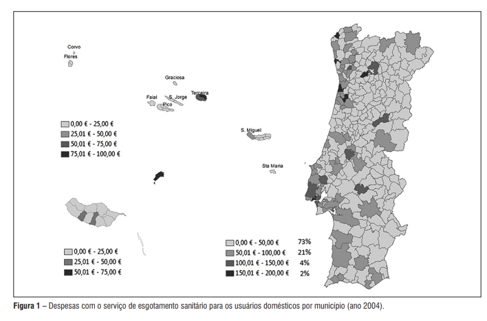 Em Portugal, a generalidade das tarifas praticadas pelos SAES não repercutem sobre os consumidores o custo real de provisão do serviço nem promovem o uso eficiente do recurso água. Deve-se salientar que em Portugal continental, em 2004, 78 municípios (cerca de 25%) não cobravam qualquer valor pelo serviço de esgotamento sanitário e que 73% dos serviços apenas cobravam um valor inferior ou igual a 50€ por ano pelo serviço de coleta e tratamento de esgoto (Figura 1), o que poderá ser insustentável, visto que, em termos médios, esses serviços têm custos da mesma ordem de grandeza ou mesmo superiores aos do serviço de abastecimento de água. Esse panorama leva os operadores a desinvestir ou a realizar apenas os investimentos críticos por falta de capacidade, o que, a médio e longo prazo, resultará na degradação das infraestruturas e na deterioração da qualidade de serviço. Por sua vez, os consumidores não têm incentivos para realizar uma gestão eficiente da água. Note-se que essa perspectiva empresarial ou de autossustentabilidade poderá ser discutida e terá de o ser forçosamente em muitos países. No entanto, em Portugal, com a Lei da Água (dando cumprimento à legislação da União Europeia e, em particular, à Directiva-Quadro da Água), o panorama de falta de sustentabilidade econômico-financeira terá de ser alterado num futuro próximo. A referida lei estabelece as bases para a gestão sustentável da água, referindo que os preços dos SAES devem respeitar os princípios do valor social, da dimensão ambiental e do valor econômico da água. Assim, além de assegurarem a recuperação dos custos de investimento e de operação dos serviços, as futuras tarifas terão ainda de incorporar uma componente relativa às taxas de utilização dos recursos hídricos, com o objetivo de internalizar os custos ambientais e de escassez. Desse modo, no cumprimento estrito da lei, avizinha-se o aumento do preço desse recurso e, consequentemente, o aumento da parcela dos rendimentos familiares a desembolsar com os SAES. A Figura 1 ilustra as despesas com o serviço de esgotamento sanitário no ano 2004, por município, para usuários domésticos com um consumo de 200 m3 de água da rede pública.
