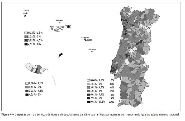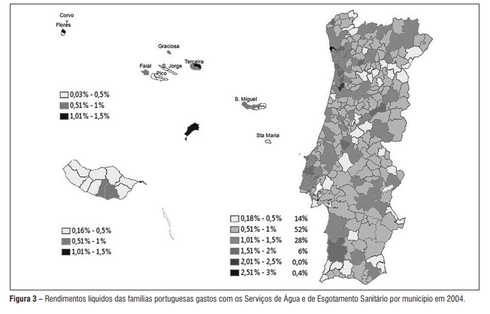 Em 2004, as famílias portuguesas gastaram em média 173,26€ por ano com os SAES, isto é, 0,87% dos seus rendimentos, valor muito próximo do verificado na Itália após a introdução da reforma (0,84%), mas superior ao registado nos Estados Unidos no final da década de 1990 (0,5%) e inferior ao verificado em Inglaterra e no País de Gales em 2004/2005 (1,02%), embora dentro do intervalo de valores recomendados pela OCDE (0,5 a 2,4%). As Figuras 2 e 3 ilustram, respectivamente, as despesas com os SAES no ano 2004, por município, para usuários domésticos com um consumo de água de 200 m3 em valor absoluto e em percentagem dos rendimentos líquidos anuais médios das famílias portuguesas. Dos 0,87% do rendimento das famílias gasto, 0,70% diz respeito aos serviços de abastecimento de água e 0,17% aos serviços de esgotamento sanitário. O valor mais elevado, 2,52%, ocorreu no município de Póvoa de Varzim (região Norte – Grande Porto) e o valor mais baixo, 0,03%, verificou-se no município do Corvo (Região Autónoma dos Açores). As percentagens mais elevadas registaram-se nas regiões Norte, Lisboa e Centro e, em geral, nos municípios situados no litoral, correspondendo a uma média de 1,03% do rendimento médio das famílias à região Norte, 0,94% a Lisboa e 0,91% à região Centro. Os rendimentos mencionados equivalem aos rendimentos líquidos anuais médios das famílias do ano de 2004.