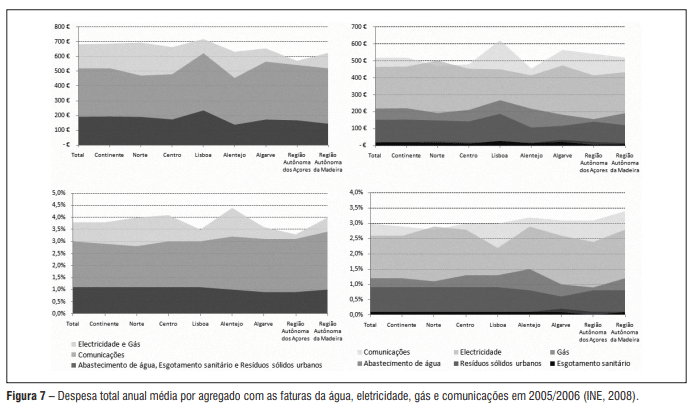 De acordo com os resultados de um inquérito realizado pelo INE (2008), um agregado familiar em Portugal gasta, em média, por ano, menos de um terço com as faturas da água (192 €) do que com a eletricidade e gás (682 €) e com comunicações (519 €). As faturas da água representam uma percentagem de 1,1% das despesas dos agregados familiares, ao passo que a eletricidade e gás representam 3,8% e as comunicações, 3%. O grupo das comunicações engloba os serviços postais, equipamentos de telecomunicação, serviços de telefone, telégrafo e telefax. A Figura 7 ilustra a despesa total anual média por agregado por NUTS II, no ano 2005-2006, com as faturas da água, eletricidade, gás e comunicações e as correspondentes percentagens.