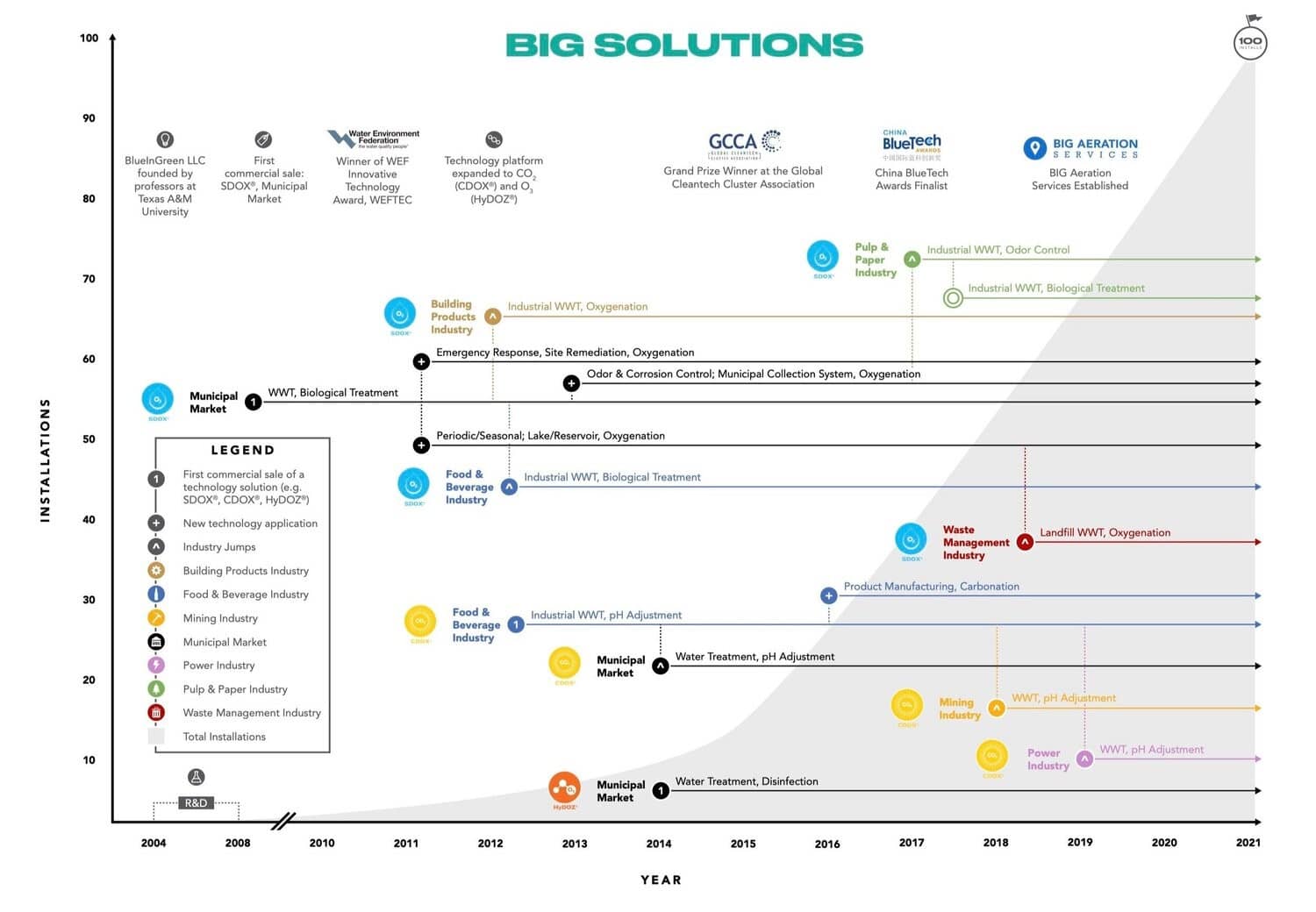 Desde 2008, o impulso da BlueInGreen disparou, sua tecnologia tornou-se particularmente popular entre aplicações industriais de alta carga. A empresa adicionou as empresas Campbell’s, Del Monte Foods, Georgia-Pacific, Koch Industries, Seaboard Triumph Foods, Tyson Foods à sua crescente lista de clientes industriais à medida que a BlueInGreen continua a crescer e evoluir – contratando funcionários para acomodar vendas recordes, estabelecendo sua divisão Tratamento-Como-Serviço, BIG-Serviços de aeração e expandindo sua linha de produtos para incluir os sistemas em contêineres móveis e totalmente funcionais, completos com controles e comunicações automatizados. Mais recentemente, a BlueInGreen foi nomeada para a lista anual Inc. 5000 da Inc. Magazine, uma vitrine exclusiva das empresas privadas que mais crescem no país.