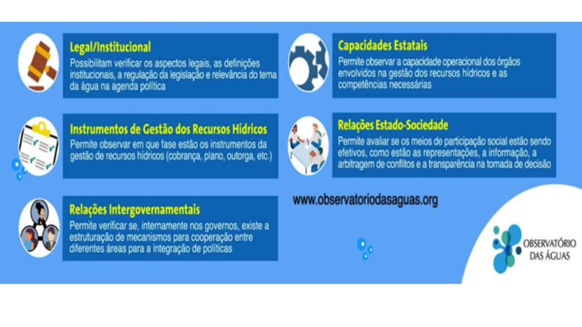 Como exemplo disso, pode-se citar que na Dimensão Ambiente Institucional, o monitoramento verifica se a água é uma agenda estratégica para a sociedade brasileira; na Dimensão Capacidades Estatais, é discutido e identificado a capacidade operacional do Poder Público em relação a qualidade e quantidade de técnicos, contribuindo assim para discussão de qual é o tamanho do Estado que é necessário para dar conta da gestão das águas na União e em cada Poder Público Estadual.