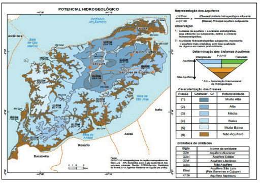 A figura 1, que compreende a região do Tamancão, conforme indicado no mapa abaixo, está envolta em região que não é aquífero e a porção de terra da referida ilha se enquadra na classe 05, onde se verifica potencial muito baixo para exploração de água.