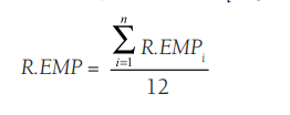 Especificamente para o cálculo da quantidade de RCD gerada no município (RCD-FOR) foram determinados dois estimadores. O primeiro diz respeito à quantidade de RCD coletada pelas empresas transportadoras desse tipo de RCD, em um determinado período de tempo, denominado de R.EMP (m3 de RCD.dia-1). Para o cálculo desse estimador, foram somadas as quantidades de RCD coletadas pelas n empresas que atuam nesse mercado (R.EMP1, R.EMP2, …, R.EMPn), dividindo o resultado pelo período em que se fez a coleta, que foi de 12 meses, conforme Equação 2.