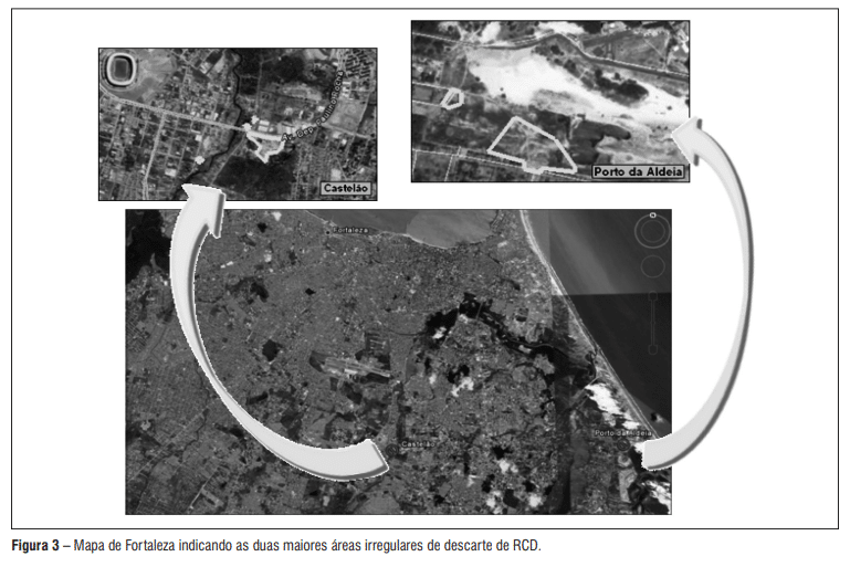 Com o intuito de se verificar a ocorrência dessa prática em Fortaleza, buscou-se mapear os principais locais de deposição irregular de RCD na cidade. Dentre os locais de descarte irregular encontrados, detectou-se a existência de uma grande quantidade que apresentava pequenos volumes de entulho; contudo duas grandes áreas de descarte foram encontradas, conforme mostrado na Figura 3, que, somadas, aproximam-se de 26 hectares.