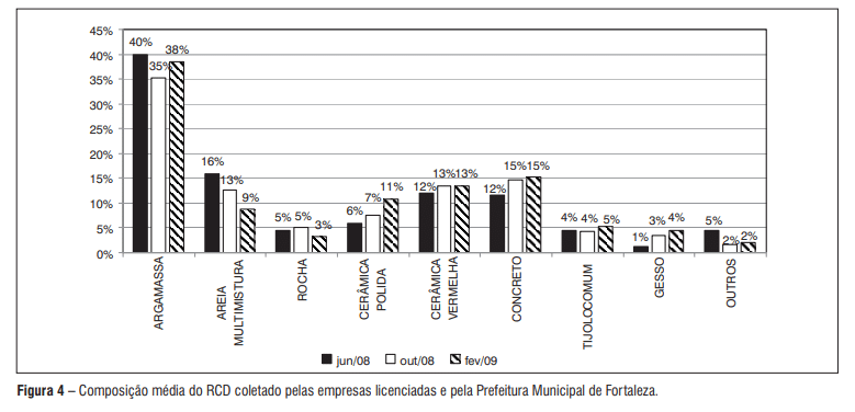Pode-se observar que a argamassa é o principal constituinte do RCD de Fortaleza, correspondendo, em média, a 38% da massa do RCD. Em seguida estão os resíduos de concreto e de cerâmica vermelha, com 14 e 13%, em média, respectivamente, do total do RCD descartado. A soma do percentual desses constituintes atinge 65% do total do RCD de Fortaleza. Esses resultados coadunam com os dos demais trabalhos desenvolvidos sobre a composição do RCD de algumas cidades brasileiras (CABRAL, 2007), uma vez que as percentagens dos constituintes argamassa, concreto e material cerâmico somam, em todas as cidades, no mínimo 62% do total do RCD.