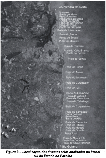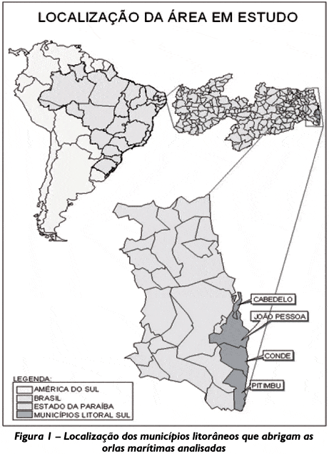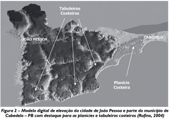 A Figura 1 mostra a localização geográfica destes municípios litorâneos onde se situam as planícies costeiras e os tabuleiros costeiros. Na Figura 2 mostra-se uma representação em modelo digital de terreno de trecho compreendido nos municípios de João Pessoa e Cabedelo, onde se visualizam as ocorrências de planície e de tabuleiros costeiros em maiores elevações, cortados pelos vales dos rios. Na Figura 3 consta a localização das diversas orlas estudadas, em imagem de satélite, onde se destacam as áreas urbanizadas nos municípios de Cabedelo e João Pessoa.
