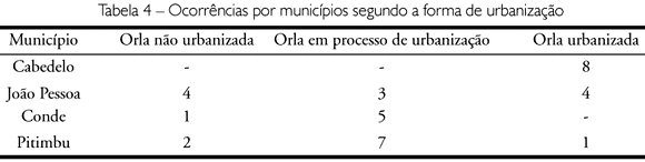O diagnóstico resumido na Tabela 5 permitiu a síntese de informações relevantes quanto ao grau de urbanização. Na Tabela 4, apresenta-se o resumo relativo ao estado da orla, por município, concernente à forma de urbanização, segundo a classificação do MMA(MMA/SQA; MP/SPU, 2002b).