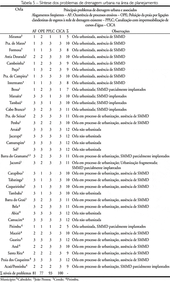 Deduz-se claramente da síntese dos problemas mostrados na Tabela 5 que as orlas compreendendo as áreas urbanizadas dos municípios de Pitimbu e Cabedelo, com destaque respectivamente para as praias de Pitimbu e Miramar (S dos níveis de relevância de problemas = 5) são as mais afetadas por problemas associados à drenagem pluvial. Em seguida comparecem as orlas de Bessa no município de João Pessoa; Formosa, Intermares e Poço, em Cabedelo.