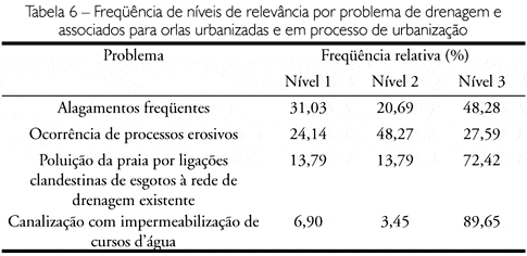 A Tabela 5 permitiu ainda a elaboração da Tabela 6, onde constam as freqüências relativas observadas dos níveis de relevância dos problemas de drenagem e associados, para as orlas urbanizadas ou em processo de urbanização.
