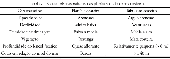Na Tabela 2 apresenta-se uma síntese, adaptada de Nóbrega (2002), das características naturais das planícies e tabuleiros costeiros, cenários de diversos problemas de drenagem de águas pluviais.