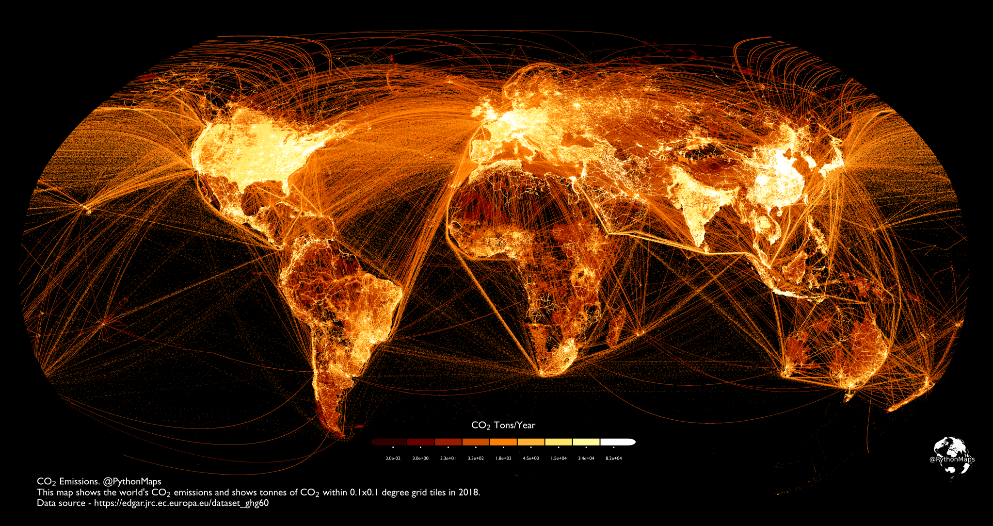 De onde vem todo esse CO₂? Este gráfico de Adam Symington mapeia as emissões de carbono em todo o mundo, usando dados de 2018 da Comissão Europeia que rastreiam toneladas de CO₂ por grade de 0,1 grau (aproximadamente 11 quilômetros quadrados).