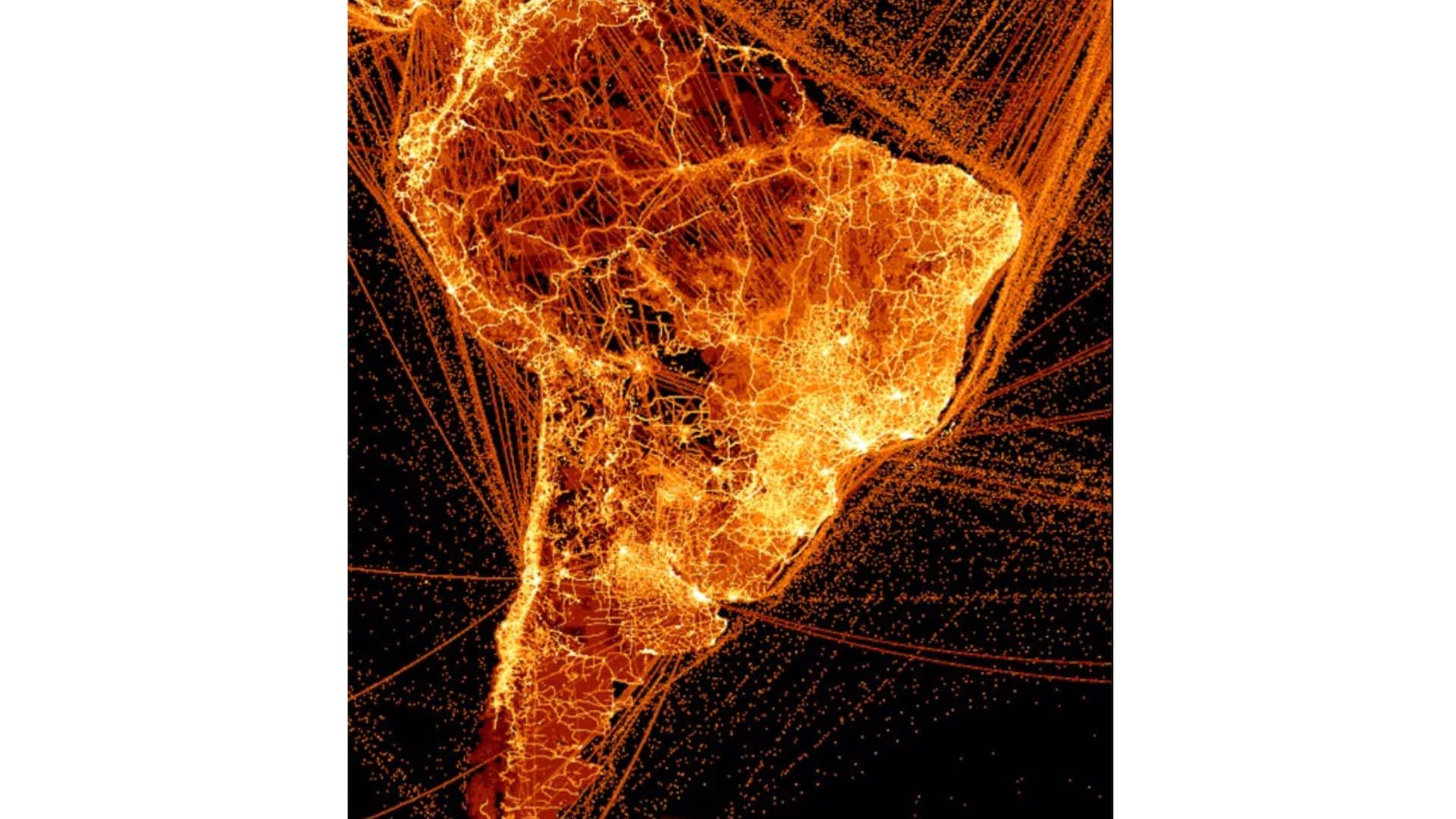 Com tanto tráfego dentro e fora dos Estados Unidos, os oceanos se tornam uma mistura obscura de rotas marítimas e aéreas. Ao sul, é bem visível a maior concentração de pessoas ao redor da Cidade do México e o tráfego que flui pelo Canal do Panamá.