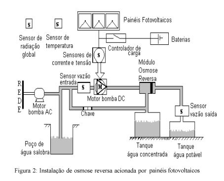 As experiências mostraram que um tratamento de água através desta combinação é viável do ponto de vista técnico. Os problemas surgidos durante o funcionamento foram devidos principalmente a um dimensionamento incorreto dos elementos para pré-filtragem. Para o caso de dessalinização de águas salobras foram alcançadas as maiores taxas de recuperação (relação entre o fluxo de água potável na saída e fluxo de água salobra ou do mar na entrada). Este fato representa uma motivação adicional para o uso de tais instalações no Nordeste do Brasil. A figura 2 mostra a proposta do presente artigo para uma instalação de osmose reversa acionada por painéis fotovoltaicos com sensores para medição de dados. O projeto tem como objetivo dessalinizar água salobra de poços por meio da energia solar para torná-la apropriada ao consumo humano (CARVALHO, 2000).