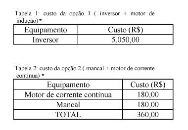 Comercialmente, uma instalação de osmose reversa é fornecida com um motor de indução. Entretanto, optou-se por um motor de corrente contínua devido ao custo do inversor necessário para o acoplamento do motor de indução ao módulo fotovoltaico. O inversor deveria suportar uma corrente de partida de 40A, condição verificada em laboratório, e deveria ter uma potência de 2500W. Na tabelas 1 e 2, percebe-se a discrepância de custos quando se compara as duas possibilidades de motor bomba da instalação de osmose reversa: