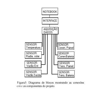 Para permitir o conhecimento dos dados medidos, foi anexado ao projeto um sistema de aquisição de dados e um microcomputador. A figura 3 mostra as conexões entre os componentes da instalação.