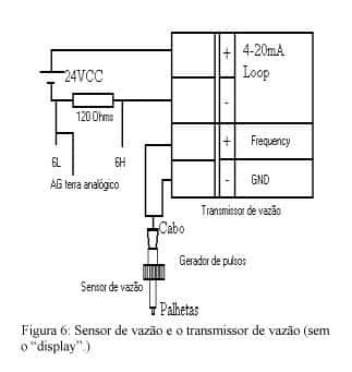 A figura 6 ilustra o sensor de vazão com suas conexões ao sistema de aquisição de dados e o transmissor de vazão com “display” não mostrado.