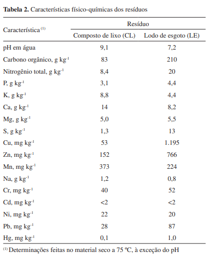 Amostras da fração terra fina seca ao ar (TFSA) dos solos na profundidade de 0-20 cm e dos resíduos foram utilizadas para a caracterização física e química (Tabelas 1 e 2), conforme metodologias descritas em Tedesco et al.,17 e para determinação dos teores de cobre e zinco. O ferro de óxidos pedogênicos (Fed) foi extraído com soluções de ditionito-citrato-bicarbonato de sódio, a 80 ºC, em duas extrações sucessivas,18,19 e dos óxidos de baixa cristalinidade (Feo), com solução de oxalato de amônio 0,2 mol L-1, a pH 3,0.20