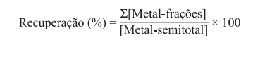 As determinações de Cu e Zn nas frações do solo foram conduzidas com base na metodologia descrita por Silveiraet al.26 e Ahnstrom e Parker,27 com algumas modificações. Foram determinados os teores dos metais associados às seguintes frações: fração solúvel (FS), extraída com água destilada-deionizada; fração trocável (FT), com nitrato de estrôncio 0,1 mol L-1; fração ligada à matéria orgânica (FMO), com hipoclorito de sódio 5%, pH 8,5; fração ligada aos óxidos de ferro mal cristalizados (FOFeMC), com uma mistura de oxalato de amônio 0,2 mol L-1 + ácido oxálico 0,2 mol L-1 a pH 3,0; fração ligada a óxidos de ferro cristalinos (FOFeC), com uma solução de oxalato de amônio 0,2 mol L-1 + ácido oxálico 0,2 mol L-1 (pH=3,0) + ácido ascórbico 0,1 mol L-1; e fração residual (FR), obtida por extração pelo método 3050b da Environmental Protection Agency (EPA).21 Detalhes dos procedimentos encontram-se descritos em Souza.25 A quantificação dos metais Cu e Zn nos extratos das frações extraídas foi realizada por espectrometria de absorção atômica por atomização em chama de ar-acetileno. Para cada metal, o grau de recuperação foi calculado por meio da Equação 1, sendo adotado como critério de controle os resultados obtidos na extração sequencial e estipulando-se em ±15% a diferença máxima tolerável em relação ao valor semitotal.