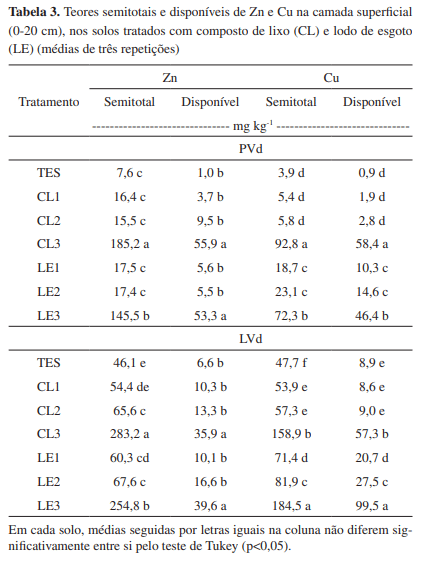 A aplicação de doses crescentes de CL e LE e o enriquecimento dos tratamentos CL3 e LE3 com Zn e Cu contribuíram para o aumento do teor semitotal destes metais na camada de 0-20 cm, para ambos os solos, como mostra a Tabela 3. Os maiores valores foram obtidos para os tratamentos enriquecidos com Zn e Cu (CL3 e LE3), os quais diferiram significativamente dos tratamentos testemunha, em ambos os solos. Para os demais tratamentos, apesar de em alguns casos diferirem significativamente dos seus respectivos tratamentos testemunha, as concentrações foram bem inferiores às determinadas nos tratamentos CL3 e LE3, para ambos os solos.