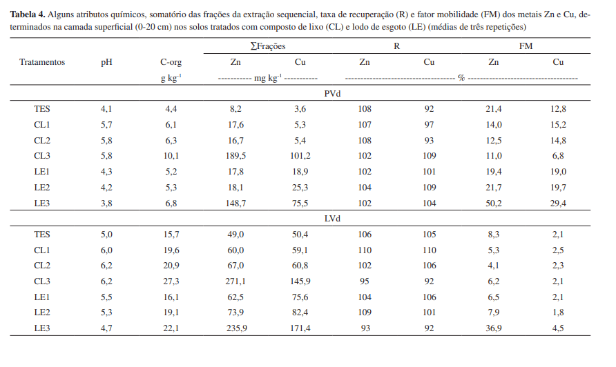 A concordância entre os valores obtidos utilizando o método 3050b e o somatório dos teores encontrados nas frações é visualizada na Tabela 4. Para o Zn, os resultados mostram uma variação no intervalo de 102-109%, com média de 105%, para o PVd, e no intervalo de 93-110%, com média de 103%, para o LVd. Para o Cu, os intervalos de recuperação foram de 93-109%, com média de 101%, para o PVd, e de 92-110%, com média de 103%, para o LVd. Pelo exposto, os resultados encontram-se dentro dos limites de erro tolerável estipulado (±15%.). Assim, observa-se, para cada elemento, que a soma das seis frações se apresenta em concordância com a respectiva concentração semitotal determinada, em ambos os solos.