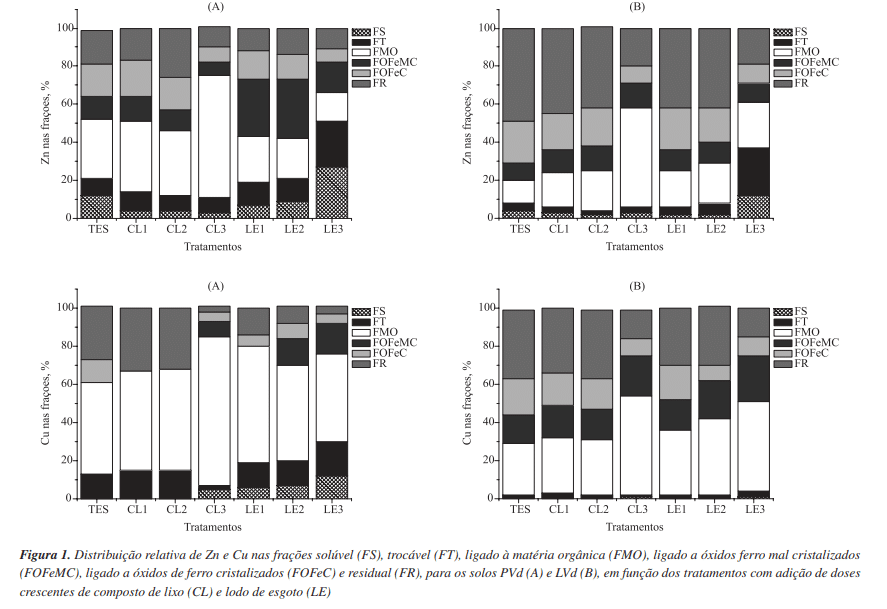 Entre os metais, geralmente, determinados nos resíduos urbanos e com concentrações expressivas tem-se o cobre e o zinco. Esses metais são considerados micronutrientes ou elementos essenciais, são requeridos pela maioria dos organismos vivos em pequenas concentrações, podendo causar toxidez quando em excesso. Assim, o presente estudo teve como objetivo avaliar, mediante extrações químicas sequenciais, a distribuição dos metais Cu e Zn nas frações: solúvel, trocável, matéria orgânica, óxidos de ferro mal cristalizados, óxidos de ferro cristalinos e residual, assim como quantificar os teores totais e disponíveis Cu e Zn e estimar sua mobilidade na camada superficial dos solos.