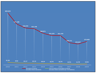 De 2010 a 2019, o país registrou uma queda importante com relação às internações por doenças de veiculação hídrica. Elas passaram de 603,6 mil para 273,4 mil internações no período, no entanto, houve um acréscimo de quase 30 mil internações de 2018 para 2019. Isso mostra que, mesmo ainda distante do ideal, a expansão do saneamento trouxe ganhos à saúde, sobretudo com a expansão das áreas de cobertura com água tratada e coleta de esgoto ao longo dos anos. Em 2010, por exemplo, 54,6% da população não tinha coleta dos esgotos, mas com o avanço, mesmo que tímido em nove anos, a população sem acesso foi reduzida a 45,9%. Sem dúvida, o avanço permitiu expressiva redução das doenças e óbitos por veiculação hídrica.