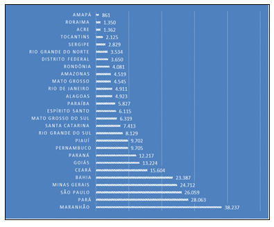 Gráfico 6 – Internações gerais por doenças de veiculação hídrica nas UFs em 2019 (do menor para o maior)