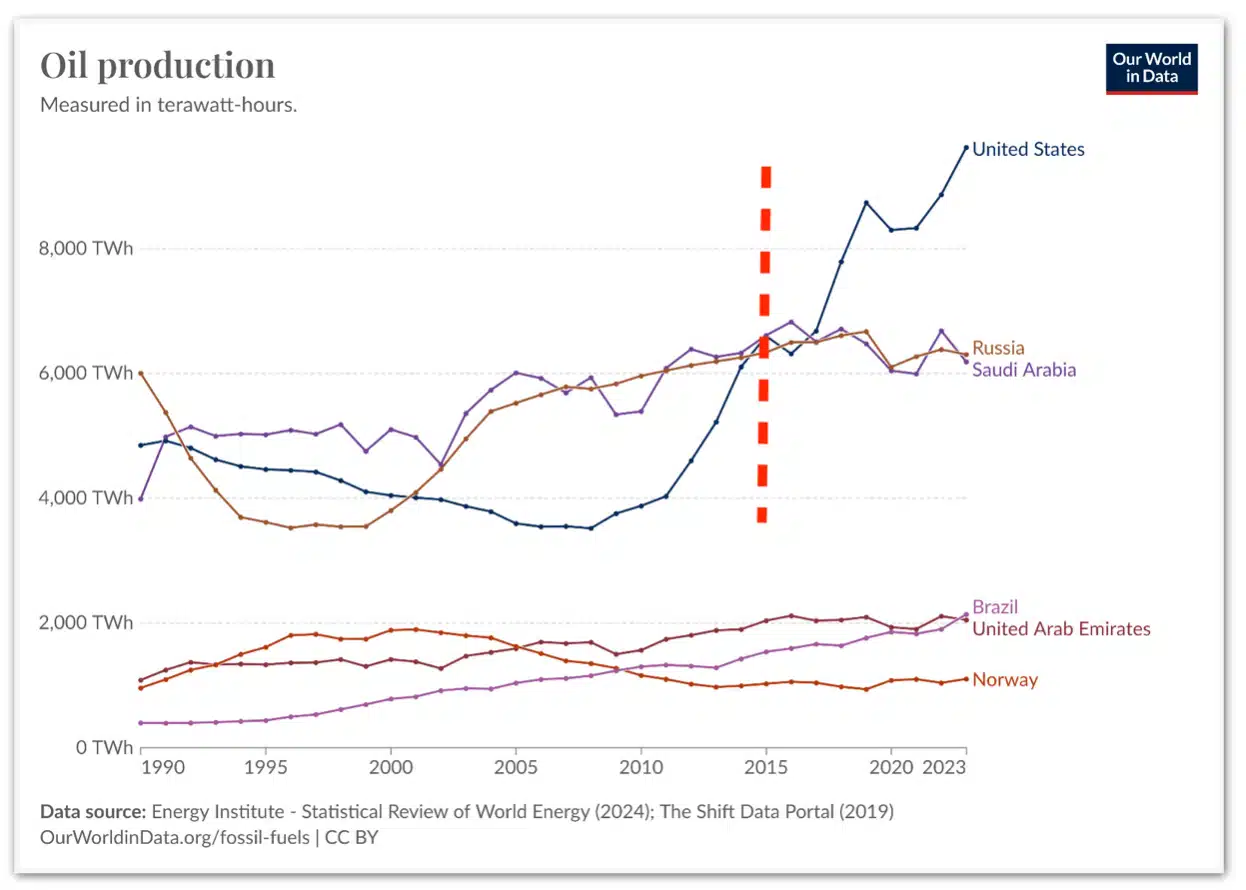 Os EUA agora produzem mais de 70% de seu petróleo e mais de 80% de seu gás natural por meio de fracking, saindo do posto de maior importador de petróleo do mundo para o maior exportador líquido. Nessa evolução, o ponto de virada histórica foi o ano de 2015.
