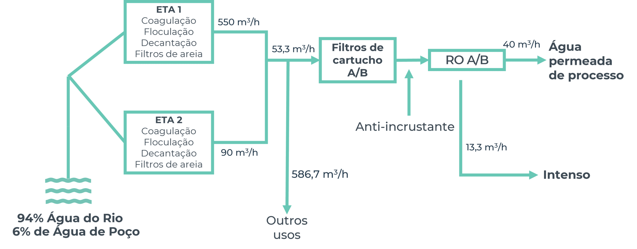 A maior parte da água a ser tratada vem de um rio e é submetida a um pré-tratamento em duas estações de tratamento de água convencionais (ETA). Essas estações consistem em um processo de coagulação-floculação com posterior decantação e filtração de areia. A ETA 1 tem uma capacidade de 550 m³/h, enquanto a ETA 2 opera com 90 m³/h. Uma vez tratada, a mistura das correntes de saída de ambas as estações passa por um sistema de filtro de cartuchos de 5 μm antes de entrar nas ORs.