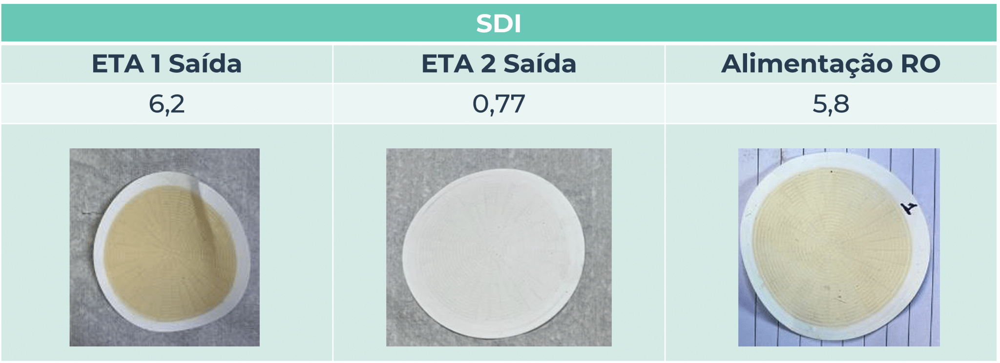 Apesar da água de alimentação do sistema de osmose reversa ter sido pré-tratada, desde o início da operação da planta, os valores do índice de densidade de sedimentos ou “SDI” (Silt Density Index) e a rápida obstrução dos cartuchos e membranas mostraram que esse tratamento não é suficiente para a qualidade exigida na entrada da osmose reversa. A tabela a seguir mostra os resultados das análises de SDI.