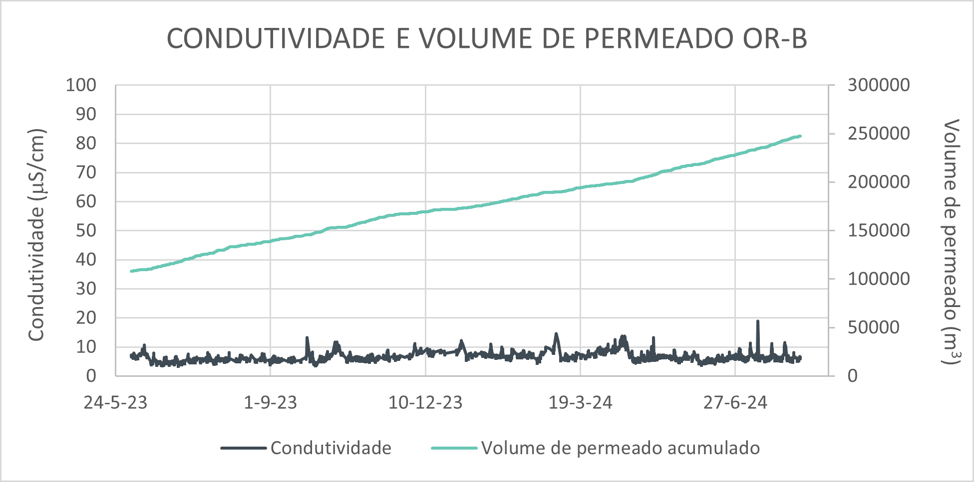 - Taxa de entupimento: depende da qualidade da água de entrada, do tempo de operação e das vazões de alimentação de operação. Embora não haja dados específicos disponíveis para esses parâmetros, pode-se inferir que uma maior inclinação na curva de diferencial de pressão indica uma maior taxa de entupimento.