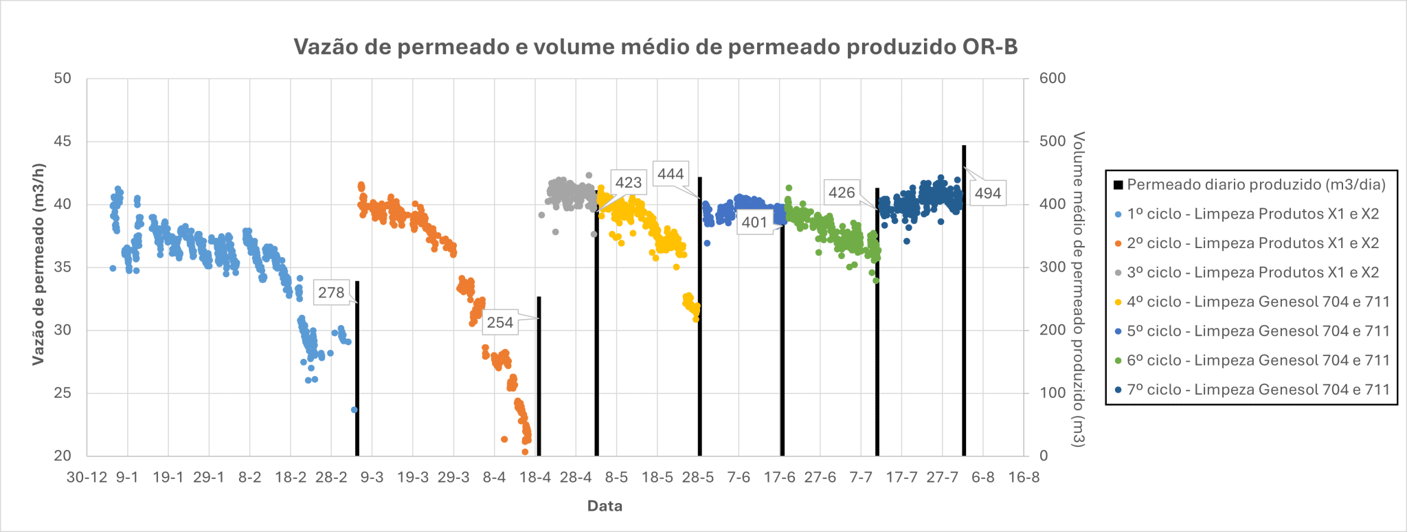 Para a análise da eficiência de limpeza, é essencial comparar as vazões e volumes de permeado produzidos após cada limpeza, bem como os valores de DP de operação. Os gráficos abaixo mostram essas variáveis para os ciclos operacionais após cada limpeza realizada este ano no 1º estágio da OR-B.