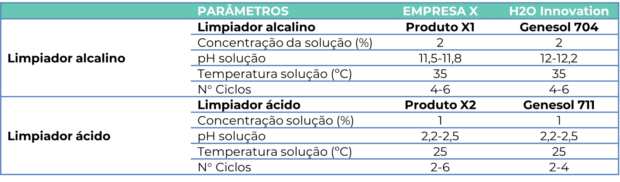 A tabela abaixo resume as características das soluções de limpeza alcalinas e ácidas, bem como os parâmetros do protocolo de limpeza aplicado em cada caso.