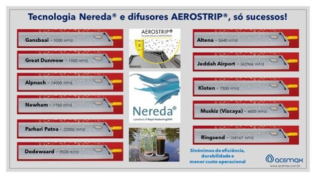 Nas muitas aplicações com a tecnologia NEREDA®, 11 projetos com os famosos difusores AEROSTRIP®, são sinônimos de eficiência, durabilidade e menor custo operacional.