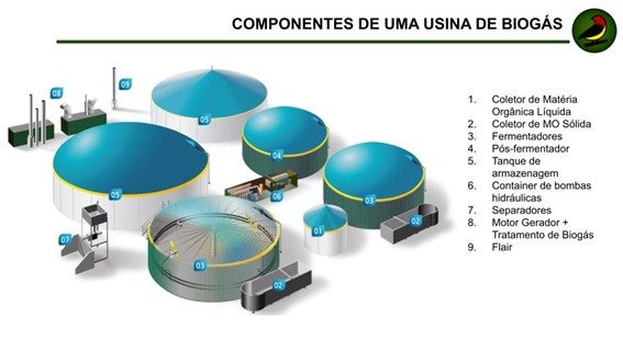 Para isso, a usina de biogás é composta de dispositivos como tanque de alimentação, tanque de fermentação, tanque de pós fermentação, tanque de armazenagem de biofertilizante e finalmente um módulo para geração de energia.
