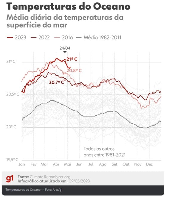 Do início de março até agora, a média global da temperatura dos oceanos em 2023 vem superando valores históricos dia após dia