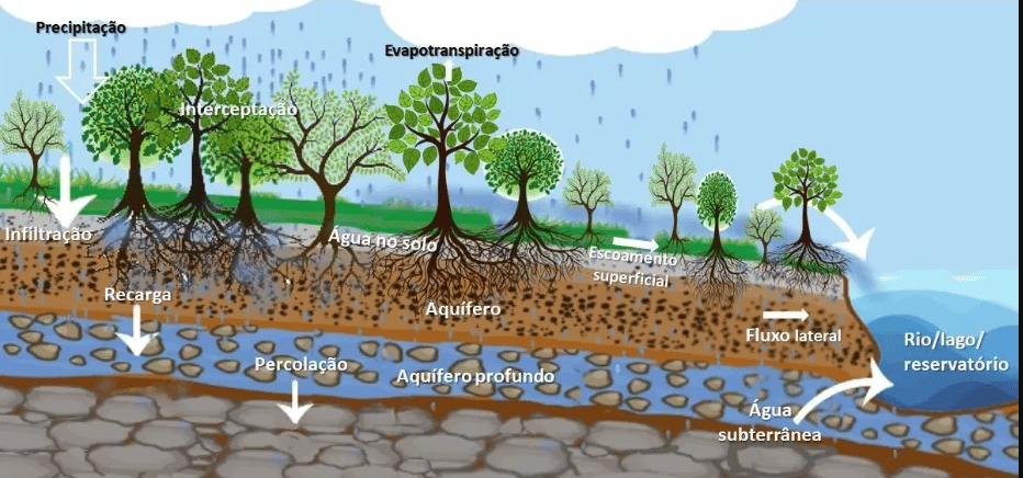 Embora a relação entre a floresta e a disponibilidade hídrica seja um tema muito discutido, gerando diversas hipóteses sobre como a cobertura vegetal pode impactar a quantidade e qualidade de água das bacias, estudos indicam a contribuição da vegetação para a saúde dos corpos de água. A redistribuição de água da chuva dentro de uma bacia hidrográfica é influenciada pela cobertura de vegetação nativa e uso da terra, conforme ilustrado abaixo.
