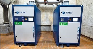 Dois turbo sopradores AERZEN, tipo AT100-0.6 S G5plus, fornecem cada um até 70 metros cúbicos padrão por minuto com alta eficiência energética