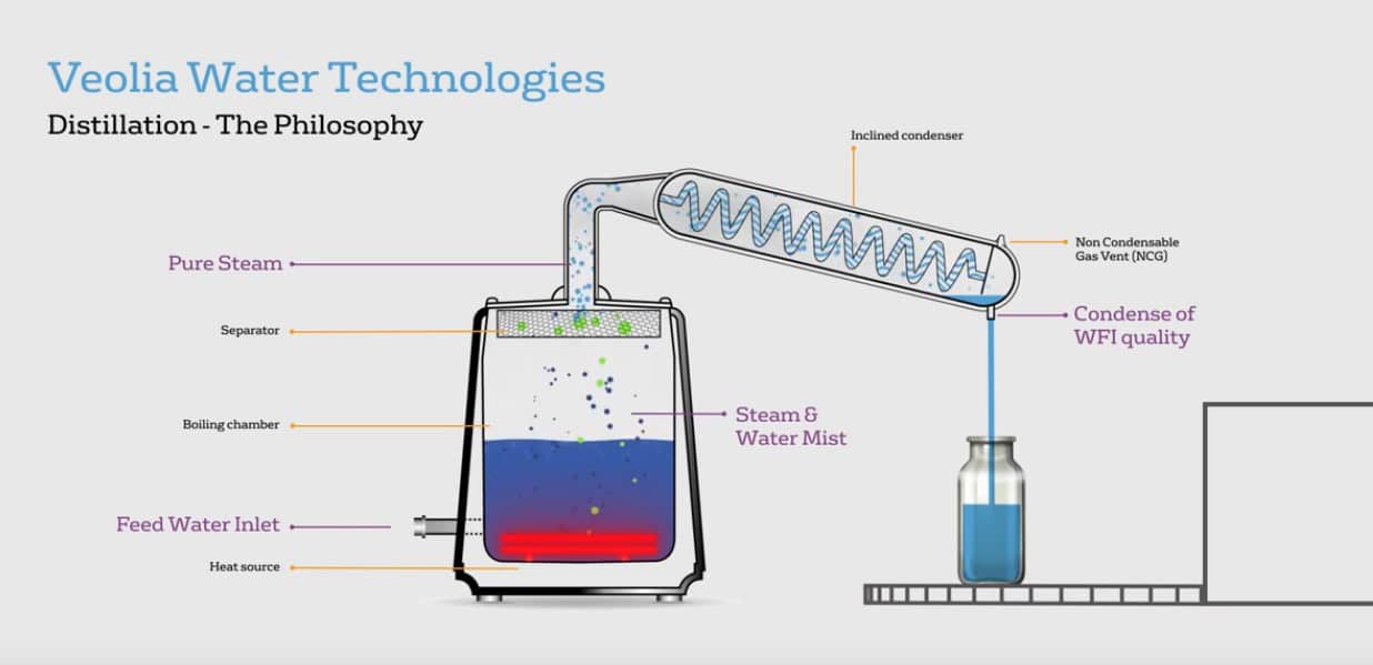 Primeiramente experimentados e testados, os sistemas de destilação tradicionais são simples em sua configuração e operação. Uma vez que alimentamos a água no sistema através da entrada de água de alimentação, realiza-se o aquecimento em uma câmara de evaporação, transformando-a em vapor e névoa de água. Após isto ter ocorrido, a substância gasosa vaporizada passa através de um separador, que remove quaisquer gotículas de água existentes que possam conter bactérias ou endotoxinas.