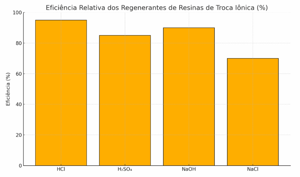 A escolha do regenerante influencia diretamente a capacidade de troca e o consumo químico: