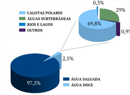 A água é primordial para a sobrevivência dos seres vivos. Precisamos cuidar desse recurso tão precioso e escasso, pois a água potável é um recurso finito que está distribuído em partes desiguais pela superfície da Terra. De toda a água existente no planeta, aproximadamente 97,5% equivalem a água salgada, imprópria para o consumo humano e, portanto, apenas 2,5% representam a água doce. Desses 2,5% de água doce, a maior parte, cerca de 69%, está concentrada nas geleiras, 30% são de águas subterrâneas que estão armazenadas em aquíferos e apenas 1% encontra-se nos rios.