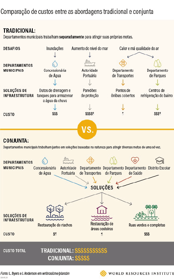 SBN são concebidas e geridas para fornecer esses e outros serviços ecossistêmicos. Por gerarem impacto positivo em áreas tão diversas, SBN são uma oportunidade para governos locais e regionais. Ao trabalharem em conjunto, diferentes departamentos podem atingir metas com um custo inferior à abordagem tradicional, em que desafios diferentes são enfrentados com soluções isoladas.