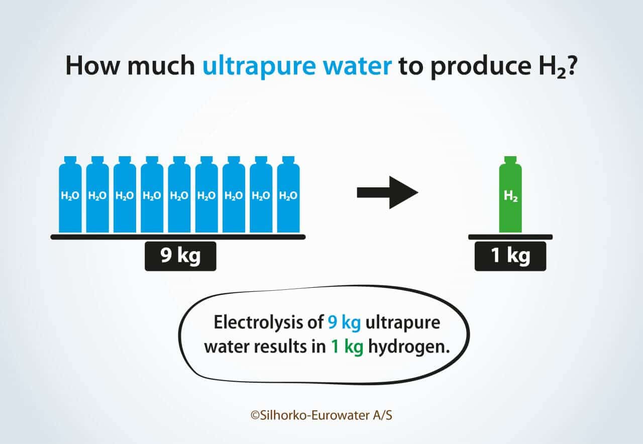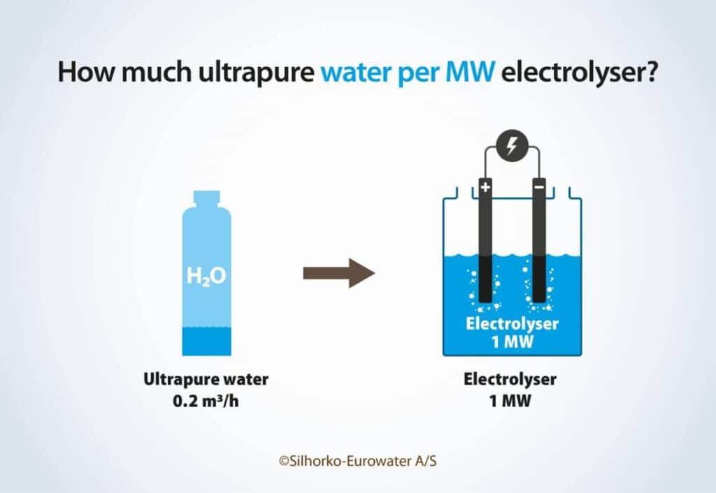 A maioria dos eletrolisadores consome 45–55 kWh por kg de hidrogênio, o que significa que são necessários 0,16–0,2 L de água ultrapura por kWh, ou 163–200 L/h de água ultrapura por MW de capacidade do eletrolisador.