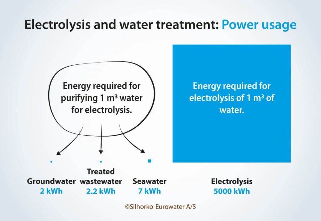 Conforme visto na Figura 4, transformar a água do mar em água ultrapura pode exigir de 3 a 4 vezes mais energia do que usar águas subterrâneas ou águas residuais tratadas, mas ainda é apenas cerca de um milésimo da energia necessária para a eletrólise.
