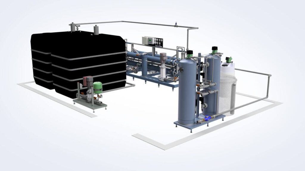 Fig. 6. Sistema de tratamento de água montado em estrutura para produção de água adequada para eletrólise (<0,1 µS/cm). Este sistema tem uma capacidade de 1–2 m3/h igual a uma capacidade de eletrolisador de 5–10 MW.