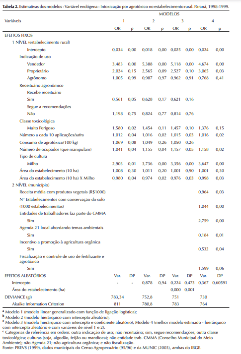 A indicação do agrotóxico pelo vendedor como fator de risco pode ser explicada pela tentativa de vender maior quantidade do produto, indicando condições inadequadas de uso. Os resultados apontam a falta de assistência técnica como um problema, e normalmente pequenos produtores que usam agrotóxicos possuem menor assistência com relação aos maiores.b A área do estabelecimento, mesmo sendo variável controle, mostrou-se positivamente associada à intoxicação, mas não estatisticamente significativa. Essa associação não foi diferente entre os municípios, considerando que o modelo com coeficiente aleatório para essa variável não se mostrou significativo.