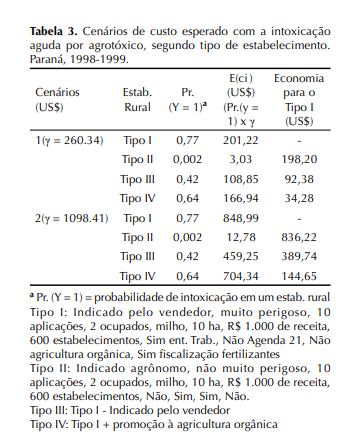 No primeiro cenário (levantamento de custos γ1), em estabelecimentos rurais do Tipo I, o custo esperado com a intoxicação aguda foi de cerca de US$ 201 (US$ 0,77 x US$ 260,34). Ao se retirarem os fatores de risco (Tipo II), o custo cairia para US$ 3 (US$ 0,002 x US$ 260,34), gerando economia ou benefício líquido social (US$ 198 por estabelecimento). A economia seria maior se considerado o segundo cenário (levantamento de custos γ2) (ganho em torno de US$ 836). Eliminar a indicação de uso do agrotóxico dada pelo vendedor (estabelecimento do Tipo III) seria a medida mais eficiente na redução do custo social de estabelecimentos do Tipo I, uma vez que a economia gerada por essa medida seria US$ 92 e US$ 389 no primeiro e no segundo cenário, respectivamente. Implantar um programa de incentivo à promoção e prática da agricultura orgânica (estabelecimento do “Tipo IV”) poderia ajudar a reduzir o custo esperado de intoxicação em estabelecimentos do “Tipo I” da ordem de US$ 144 no cenário 2.