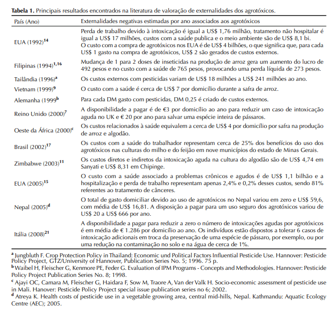 A literatura econômica oferece vários métodos no campo da valoração das externalidades. Essa diversidade metodológica e a dificuldade de se dispor de dados refletem em resultados distintos, pois cada estudo abarca uma ou mais externalidades provocadas pelo uso dos agrotóxicos sobre a saúde ou o ambiente.b A Tabela 1 resume os principais resultados encontrados nas bases de dados Scopus, SciELO e Medline em ordem cronológica. Independentemente do conjunto de custos sociais incorporados e da metodologia utilizada em cada estudo, é importante perceber que todos os resultados apontam para significativo volume de recursos socializados.