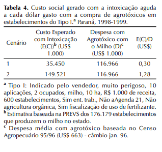 Caso os 176.179 estabelecimentos rurais produtores de milho estimados pela PREVS tivessem características iguais às do Tipo I, o custo agregado esperado com a intoxicação seria de aproximadamente US$ 35 milhões (US$ 201,22 x 176.179) e US$ 149 milhões (US$ 848,99 x 176.179) no primeiro e segundo cenário, respectivamente (Tabela 4). A despesa média com agrotóxicos foi de US$ 663, de acordo com os dados do Censo Agropecuário de 1995/96, o que daria uma despesa para o Estado da ordem de US$ 116 milhões (US$ 663 x 176.179). Para cada dólar gasto com agrotóxicos em estabelecimentos do Tipo I, cerca de US$ 0,30 seriam gerados em custos associados à intoxicação aguda por agrotóxicos e US$ 1,28 sob a perspectiva do segundo cenário (Tabela 4).